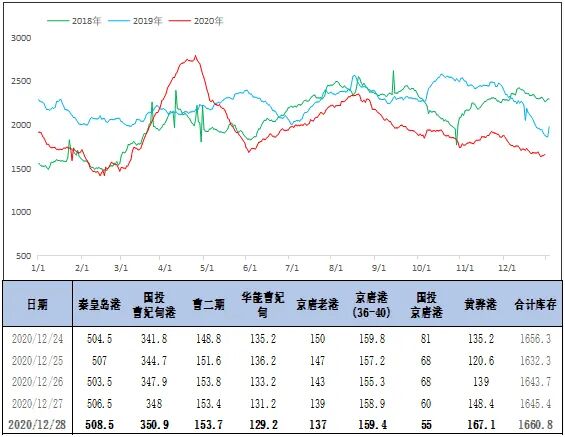 临近年末,部分煤矿生产减量或暂时停产,不过在政策全力保供增运下,港口调入量有所增加;而冬季取暖用煤和工业用煤需求旺盛,终端拉运积极,但受大风天气影响,各港封航频繁,调出量略有减少,在整体调入略高于调出的情况下,环渤海四港库存小幅回升至1660.8万吨,环比增加15.4万吨。