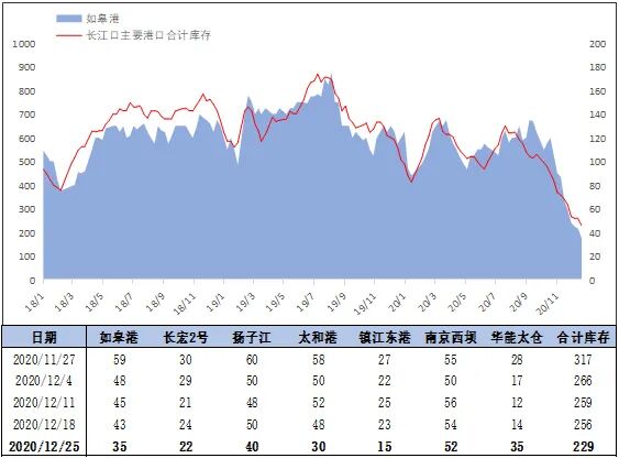 近期,江内本周库存量延续下降态势,截至12月25日,长江口九大主要港口合计库存272万吨,环比上期下降32万吨。
