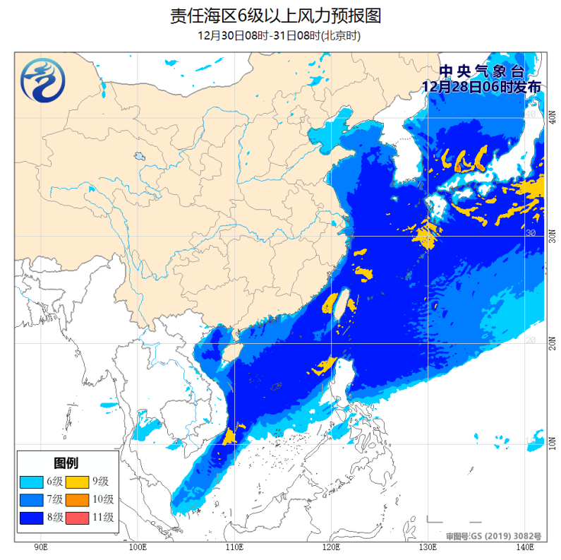 30日08时至31日08时,渤海、渤海海峡将有6~7级、阵风8级的西北风,黄海大部海域、东海大部海域、台湾海峡、台湾以东洋面、巴士海峡、北部湾、琼州海峡、南海大部海域将有7~8级、阵风9~10级的大风,其中东海、台湾海峡、台湾以东洋面、南海中东部和西南部海域的部分海域风力可达9级、阵风10~11级。