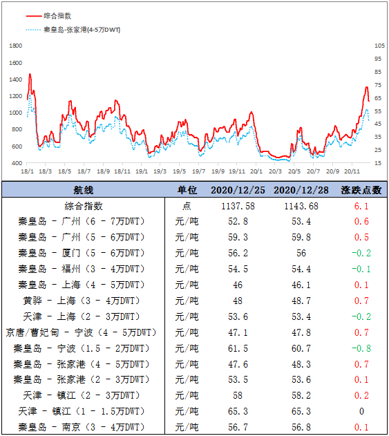 今日市场虽成交有限,不过看好氛围明显增强;跨年寒潮正式发货,中东部“速冻”模式开启,日耗将再次攀高,而煤炭供不应求格局加剧,刺激部分终端电厂采购需求释放;叠加上下游港口封航,船舶周转下降,市场可用运力受损,运价支撑较强重回上行通道。