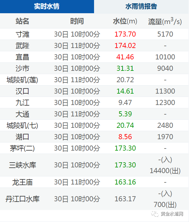 【水情】长江流域重要站实时水情(2020年12月30日10时)