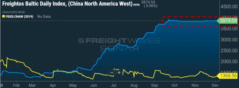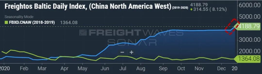 亚美跨太平洋航线集装箱需求自9月中旬以来一直在波动且愈发强劲,但亚洲到美西的集装箱运价自9月底以来一直出奇平稳,基本保持在3800美元至3900美元/FEU相对高位窄幅区间浮动。在需求波动巨大的最近几个月,运价趋势曲线的平稳导致人们遐想,跨太平洋地区的运价水平实际上是不自然的。而同期中欧的运价则增长了67%。