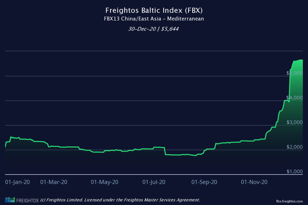 近期英国发现变异病毒致欧洲各国管控升级,此外英国脱欧时限邻近导致港口业务繁忙,再加上年末又值圣诞季,欧洲市场货量处于高位,也加剧了欧洲港口拥堵,导致集装箱周转不畅,供需矛盾加剧。受此影响,船公司继续提涨运价,欧洲航线即期市场价格在25日出现大幅攀升。地中海航线,市场情况与欧洲基本相似,即期市场运价在15日出现大涨后维持平稳。