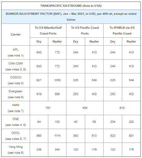 服务于东亚/美国贸易航线(美国进口)的多家承运人已经调整了燃油附加费,自2021年1月1日至3月31日生效。这是承运人在FMC关税中公布的附加费:
