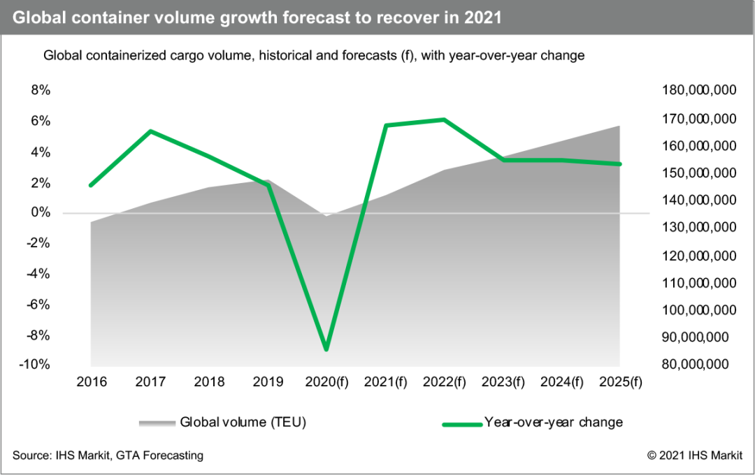 预计2021年全球集装箱运量将增长5.8%,但运力只会增长2%至3%。
