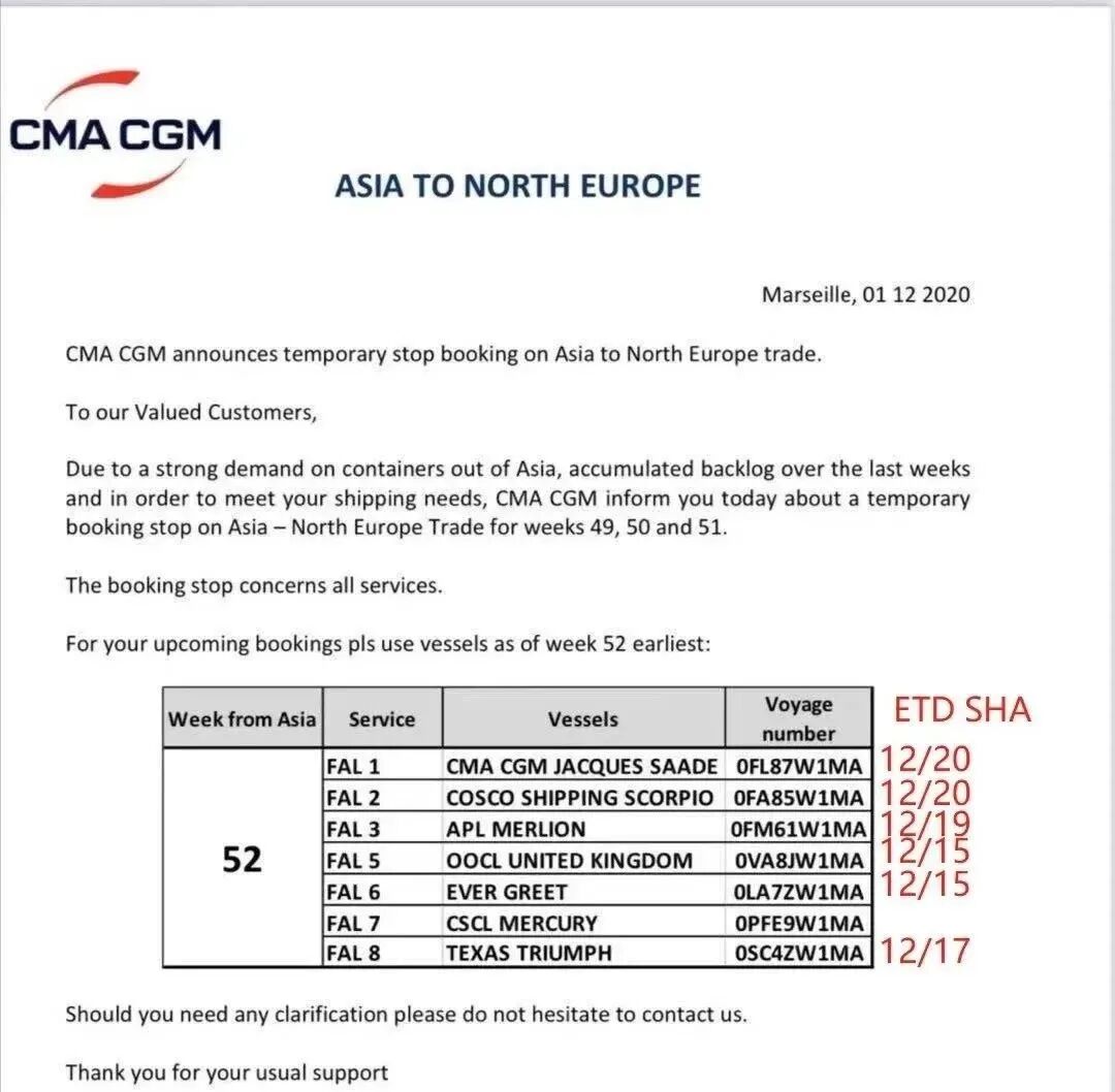 达飞CMA CGM通知,暂时停止接受未来3周从亚洲到欧洲的订舱,第49周、50周和51周的亚洲-北欧航线临时停止订舱,从52周开始接舱。欧洲线基本已经结束了今年的订舱。