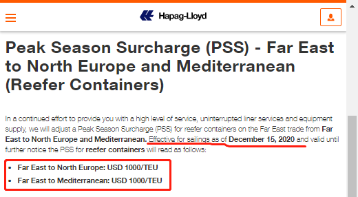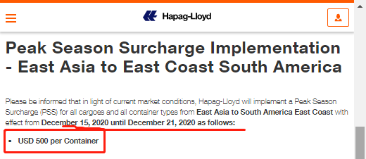 赫伯罗特宣布,自2020年12月15日至2020年12月21日,将对从东亚至南美东海岸的所有货物和所有集装箱类型征收拥堵附加费(PSS)USD500/TEU!