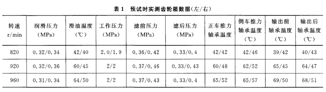 该型齿轮箱接排转速为450r/min,在低 转速情况下,齿轮箱润滑油压力、工作压力、滑油温度、推力轴承温度、支点轴承温度及摩擦片离合器箱体处温度均处于正常状态。