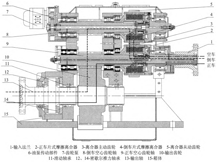 正车离合器壳体上的主动齿轮与倒车离合器壳体上的从动齿轮啮合,倒车离合器壳体通过内外摩擦片与倒车空心齿轮轴联接,倒车空心齿轮轴上的齿轮与输出轴上的齿轮相啮合。