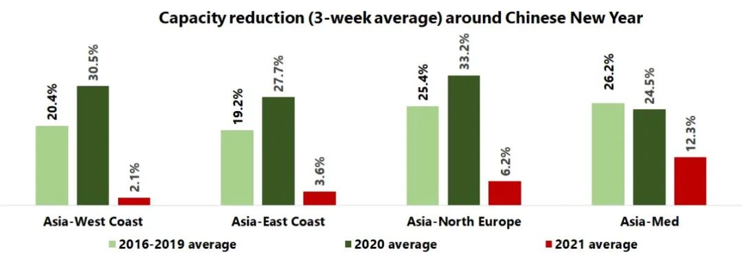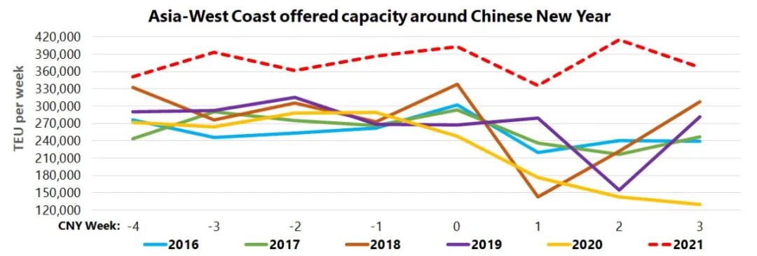 今年春节目前预报美西航线的运力仅下降1.2%。亚洲东海岸的降幅仅为3.6%。与此形成鲜明对比的是,2016-2019年春节平均降幅分别为20.4%和19.2%。
