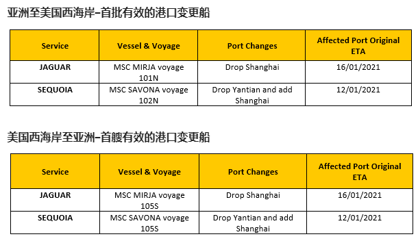 MSC已决定在其跨太平洋服务网络上进行一些其他结构上的更变更,从2021年1月起生效,直到另行通知,以在当前充满挑战的市场中提供最可靠的服务。以下是受到影响的服务和船只,涉及多艘船舶以及国内上海、深圳、新港等港口。