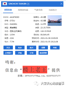 “SINOKOR TIANJIN”轮(中文叫“长锦天津”轮)2021年1月3日离开香港,预计8日2300时抵釜山。