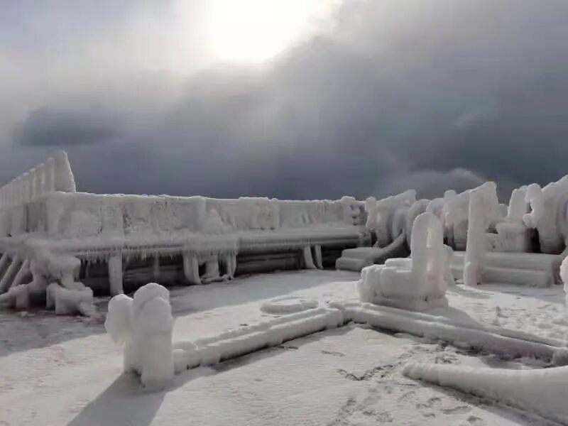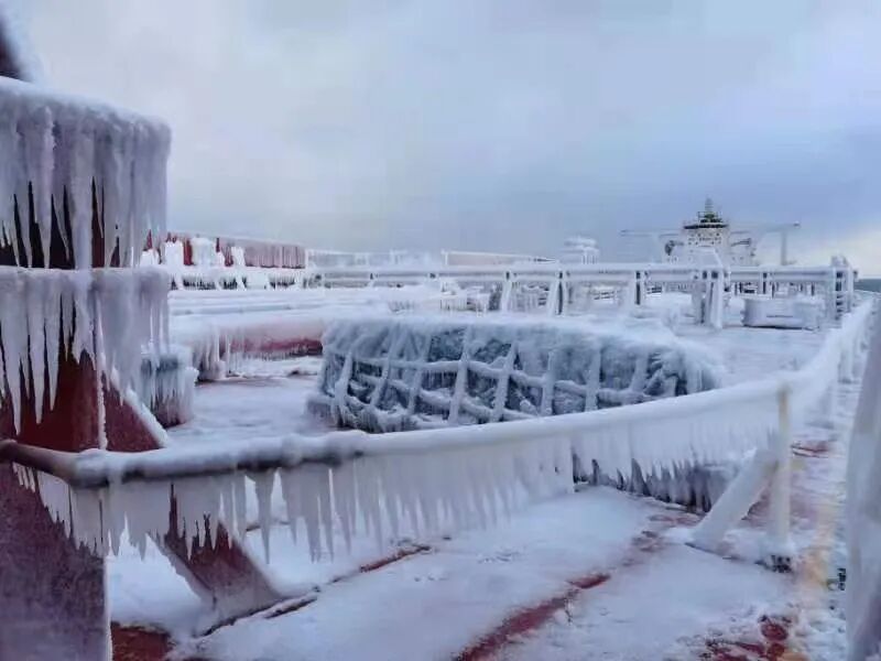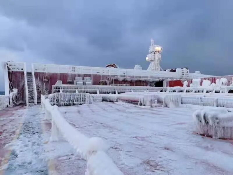 2021年1月7日早上,远谊海轮如期抵达烟台锚地准备抛锚。由于一路北上上浪,加上室外零下13度的低温,船舶仿佛被“速冻”。当船长从望远镜向船首望去时,看到从4舱往前所有舱盖、轨道、锚机、缆机、缆桩、前桅都覆盖在厚厚的冰层下,我们置身海上的“冰雪世界”。