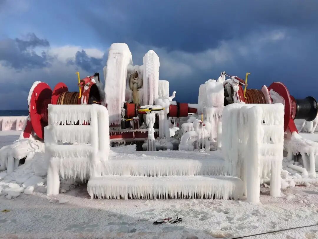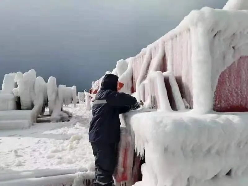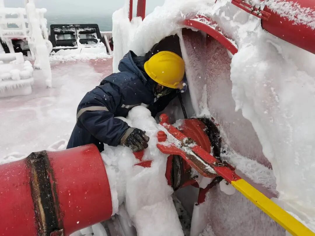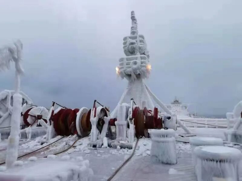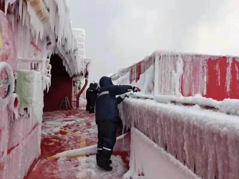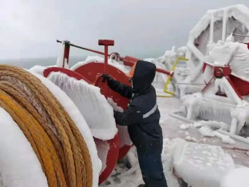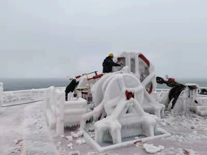 零下13度甲板上,寒风呼啸,尽管大伙穿上棉衣,仍是透骨凉。厚厚的冰层坚硬无比,一大锤砸下去也只是一个小小的坑。大伙不畏艰辛消雪除冰,船长、政委、轮机长全上阵,大副下班后也来帮忙,大家上下一心、热血奋战一线,经过两天奋斗,终于在8日晚餐前让船舶甲板机械设备恢复了正常运作。