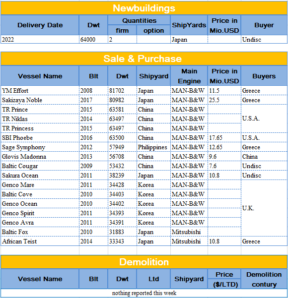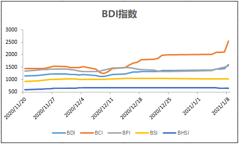 BPI周五报收1,559点。巴拿马型船期租水平报收14,031美元/天。巴拿马型船市场上涨。大西洋市场需求旺盛,美湾82k成交大概在17,750美元/天,加 775,000 美元的空放补贴左右,南美需求强烈且船舶数量不足,82k成交迅速涨至16,500美元/天,加 650,000 美元的空放补贴的水平。太平洋市场同样表现活跃,市场上货盘充足,叠加船东空放大西洋意愿的压力,租家不得不一直提高租金。期货市场近期同样大涨,期租成交活跃。