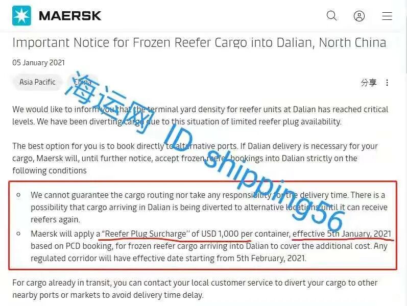马士基将从2021年1月5日起根据PCD的预定对抵达大连的冷藏箱货物收取1000美元/每箱的“冷藏箱附加费”,任何受管制的通道将从2021年2月5日起生效。