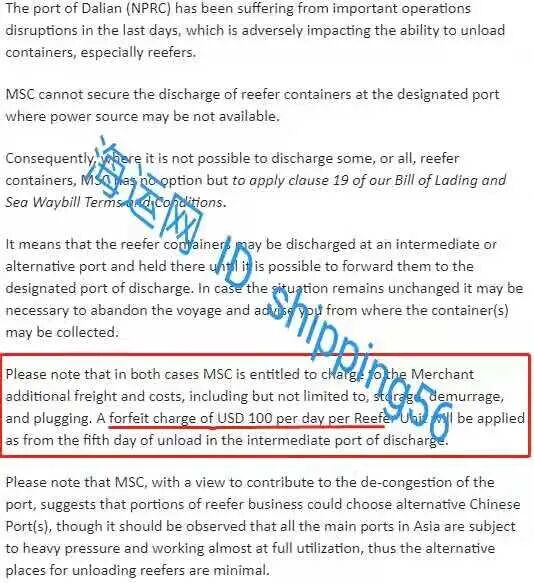 请注意,在这两种情况下,MSC有权向客户收取额外的运费和成本,包括但不限于储存费、滞期费和堵塞费。从中转港或替代港卸货的第五天起,每个冷藏箱每天收取100美元的forfeit charge罚没金。