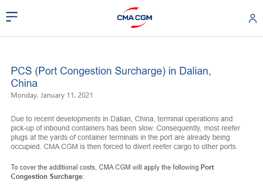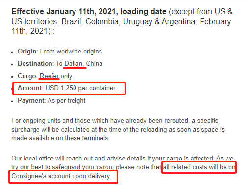 继马士基、地中海航运1月5日起分别对大连冷藏箱征收1000美元附加费、每箱100美元罚没金后;(2M 5日起分别对大连冷藏箱征收1000美元附加费和每箱100美元罚没金)法国达飞轮船也发布公告,因大连港码头运营及入港集装箱提货缓慢。港口集装箱码头堆场的大多数冷藏箱插头已经被占用。CMA CGM被迫将冷藏箱货物转运到其他港口。为支付额外费用,将收取以下港口拥堵费:每个集装箱1,250美元港口拥堵费。