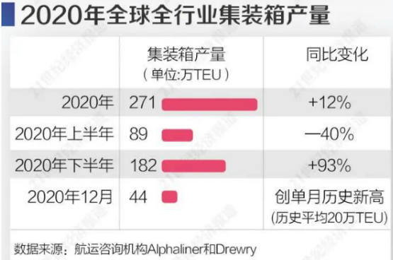 从全球来看,2020年全行业集装箱产量271万TEU,比2019年增加12%。其中,上半年市场低迷产量仅89万TEU,同比减少40%,下半年市场火爆产能提升后达到182万TEU,同比增加93%。12月份单月产量44万TEU,创单月历史新高。