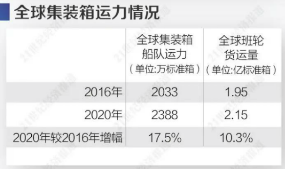 全球权威航运咨询机构Alphaliner和Drewry提供的运力供给及货量需求的第三方数据,2016年,全球集装箱船队运力2033万标准箱,全球班轮货运量为1.95亿标准箱。2020年,全球集装箱船队运力2388万标准箱,预计全年班轮货运量为2.15亿标准箱。5年运力增长了17.5%;货量仅增长了10.3%;年均运力供给增幅为4.3%,年均货运量需求增幅仅为2.6%。