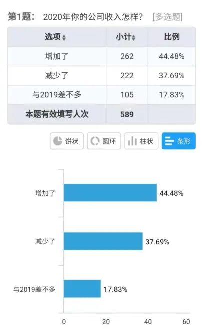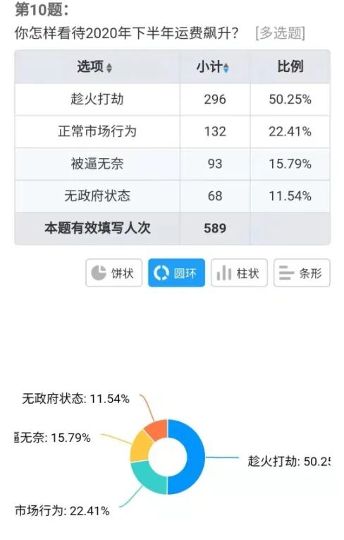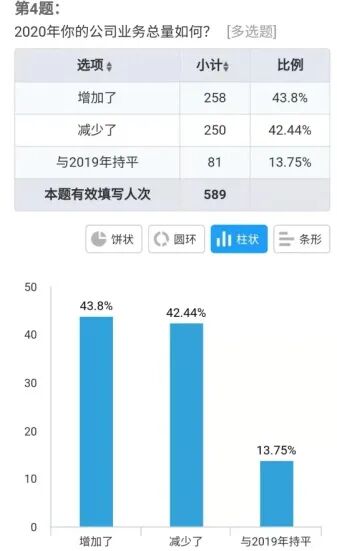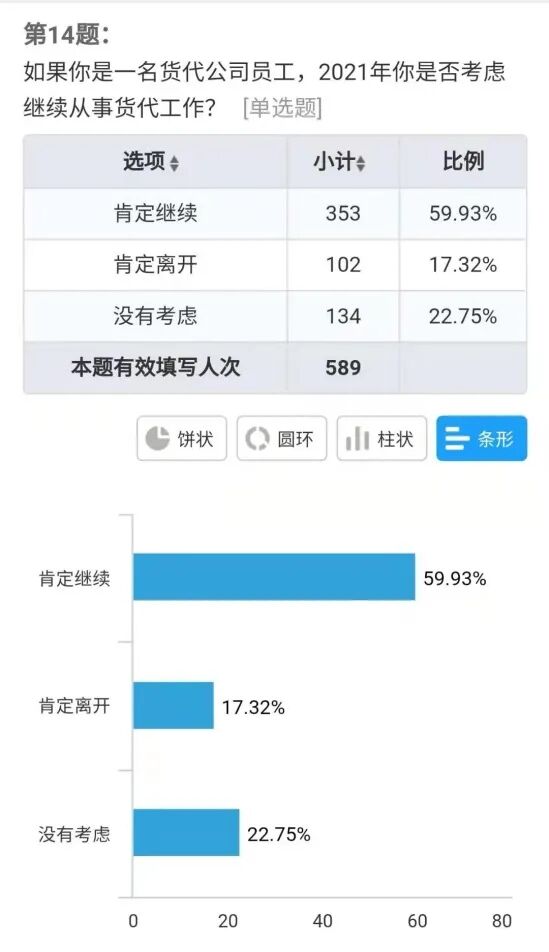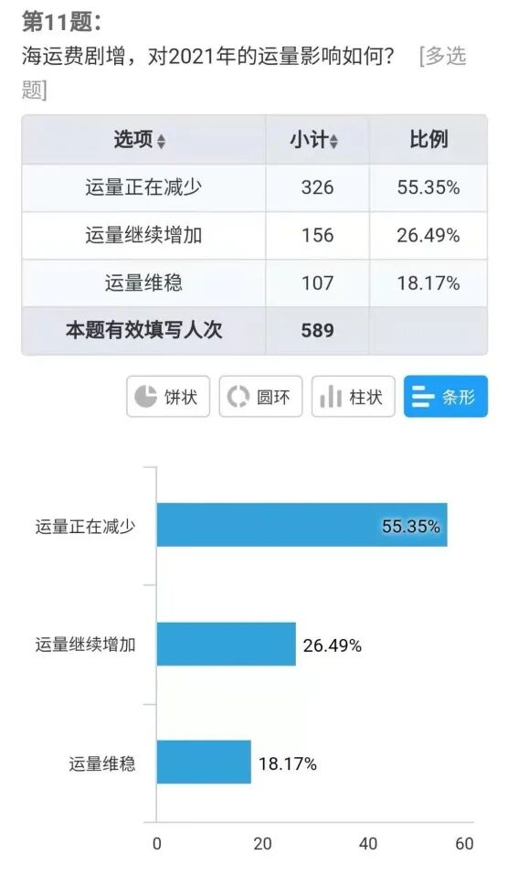 中国国际海运网和中国物流与采购联合会WIFFA分会共同举办主题为“货代不能不说的2020与2021” 调查问卷。问卷活动持续10天,有效问卷589张。问卷内容包括2020年货代业绩、从业人员收入、公司资金和2021年市场走势预判、行业信心以及当前海运费涨价等五类焦点问题。