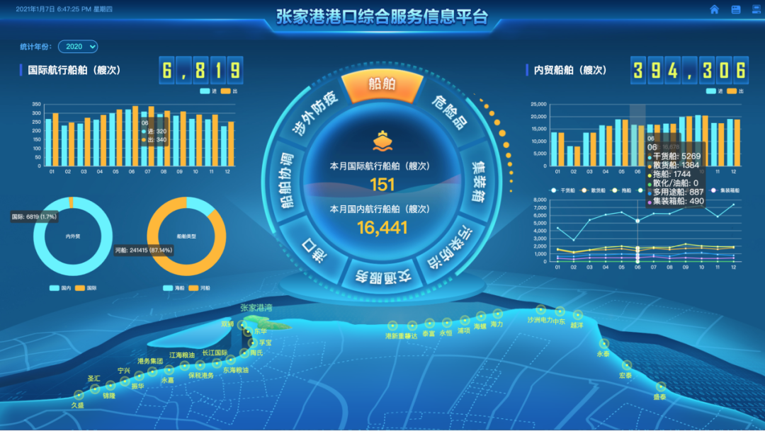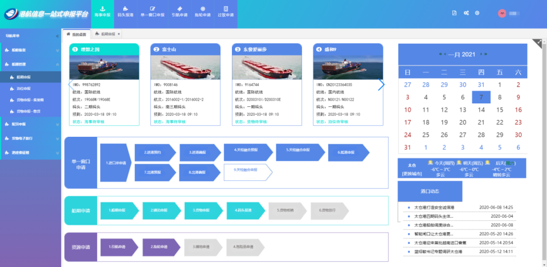太仓港航信息一体化共享系统依托港航一站式申报、港航综合调度服务、港航安全管理、选船管理四大平台提供支撑。