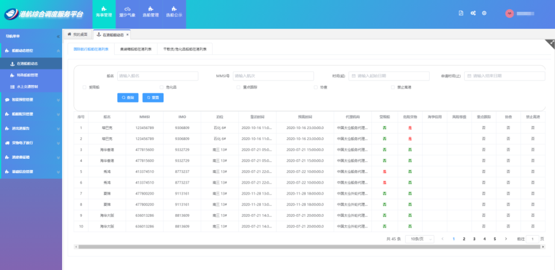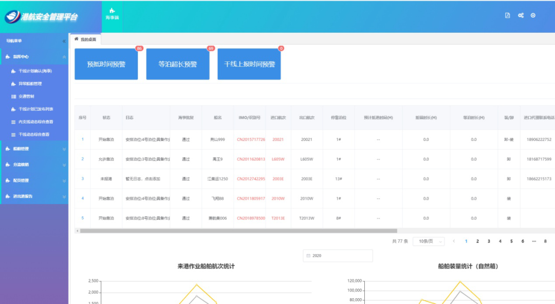 港航安全管理平台在准确掌控“船、港、货”等动态基础上,接入船舶基础数据、船舶进出港报告、船员基础数据、重点跟踪、协查、海事行政处罚、信用名单、船舶国籍证书等海事数据,提供个性化的智能预警、船舶管控、货物管理等功能,提升海事监管服务效能。