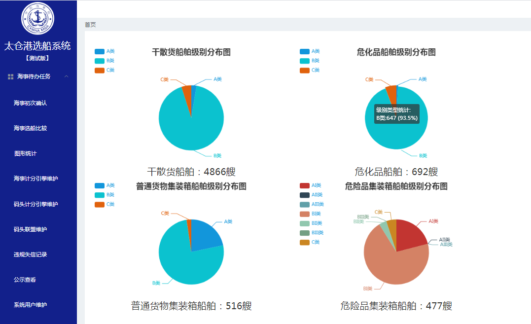 选船系统旨在实现太仓港干散货船舶、集装箱船舶、危化品船舶高质量选船评估电子化。该平台接入海事信用名单、突出违法行为、船舶风险等级、重点跟踪、协查、事故等海事管理数据,选船结果直接推送到港航综合调度服务平台应用。