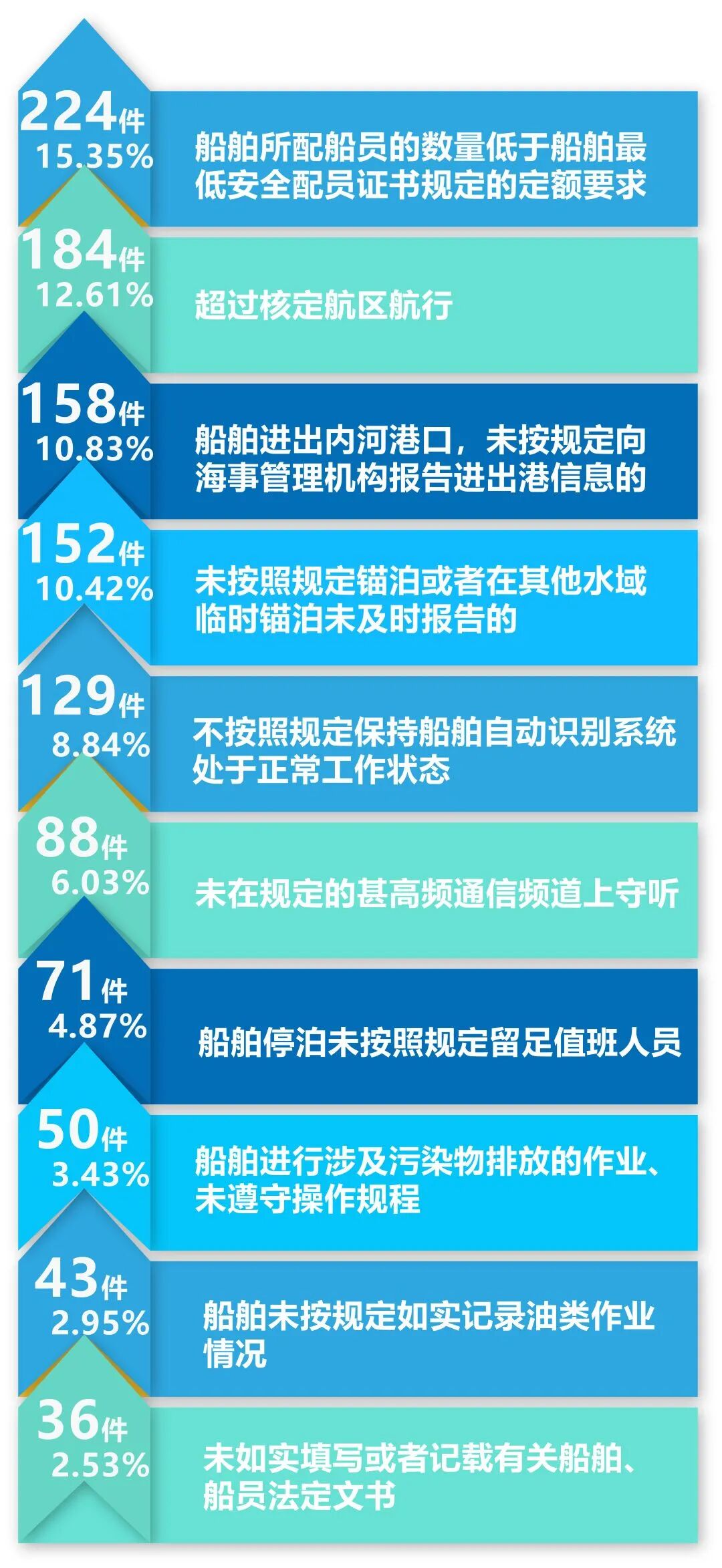 经统计,2020年海事行政处罚中最常见的违法行为包括以上10项,共计1146件,占常熟辖区年度总处罚案件的80.42%。