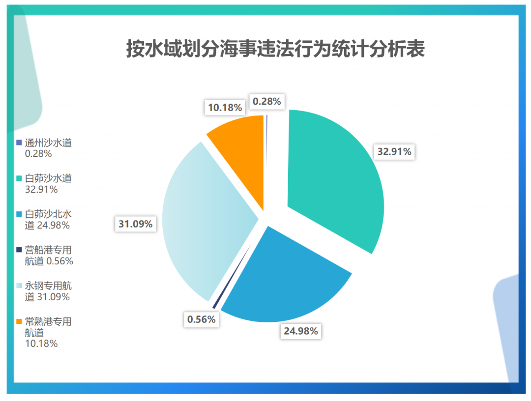 2020年,按发生水域的情况来看,违法行为主要集中在白茆沙水道、永钢专用航道、白茆沙北水道、常熟港专用航道等水域,占比分别为32.91%、31.09%、24.98%、10.18%。