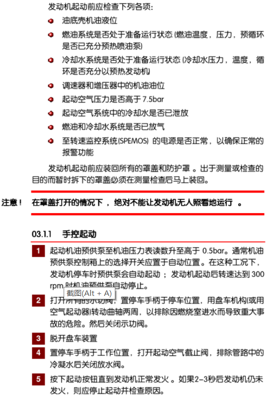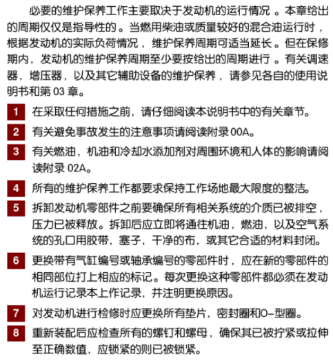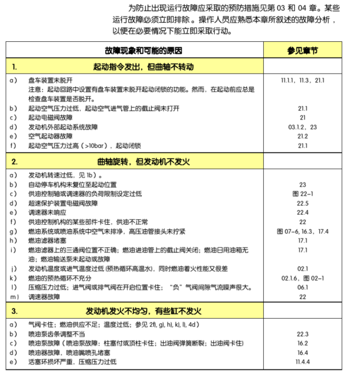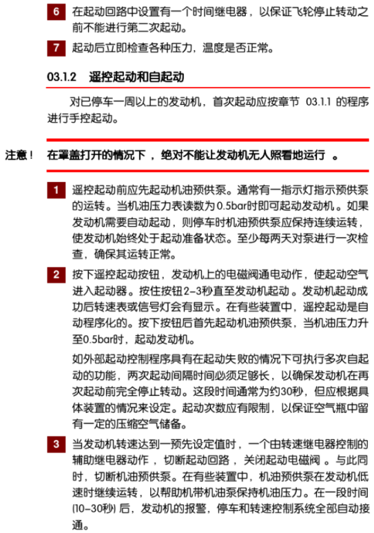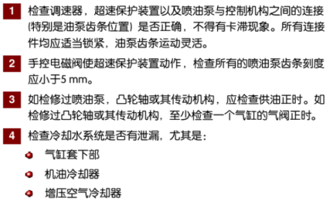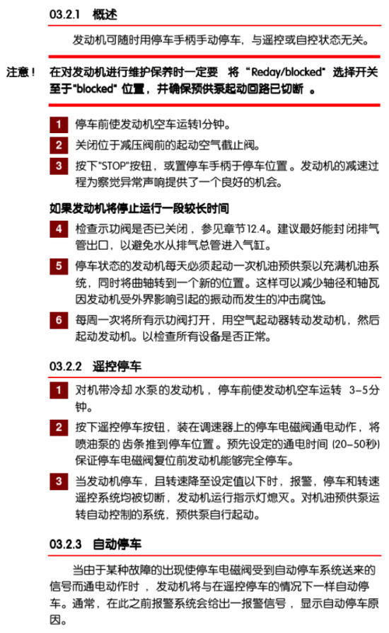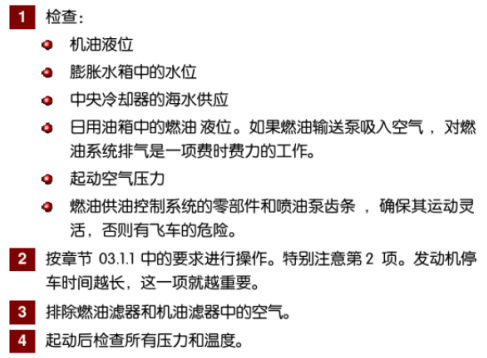 进行发动机维护保养之前一定要确保自起动系统和预供油泵的起动回路已切断,主起动阀的起动空气截止阀已关闭,起动空气管路压力已泄放。