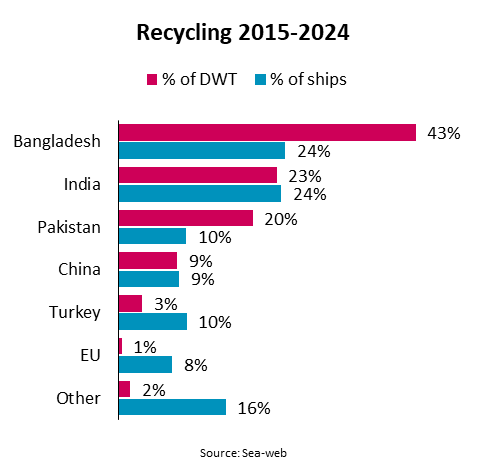 回顾2015至2024年期间,孟加拉国、印度和巴基斯坦三国依旧是全球船舶回收的主要目的地,合计拆解了86%的总载重吨和58%的船舶数量。自2017年以来,中国停止接收国际船舶拆解后,三国的主导地位更加巩固,中国目前仅占全球拆船载重吨的不到2%。