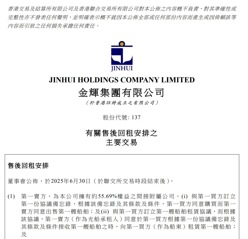6月底,金辉航运间接附属公司与农银金租旗下的两家子公司——天津津海十五租赁有限公司及天津津海八租赁有限公司,分别就旗下两艘散货船“JIN HENG”号与“JIN LI”号达成售后回租安排,交易总金额达离岸人民币2.03亿元(折合约2.22488亿港元)。
