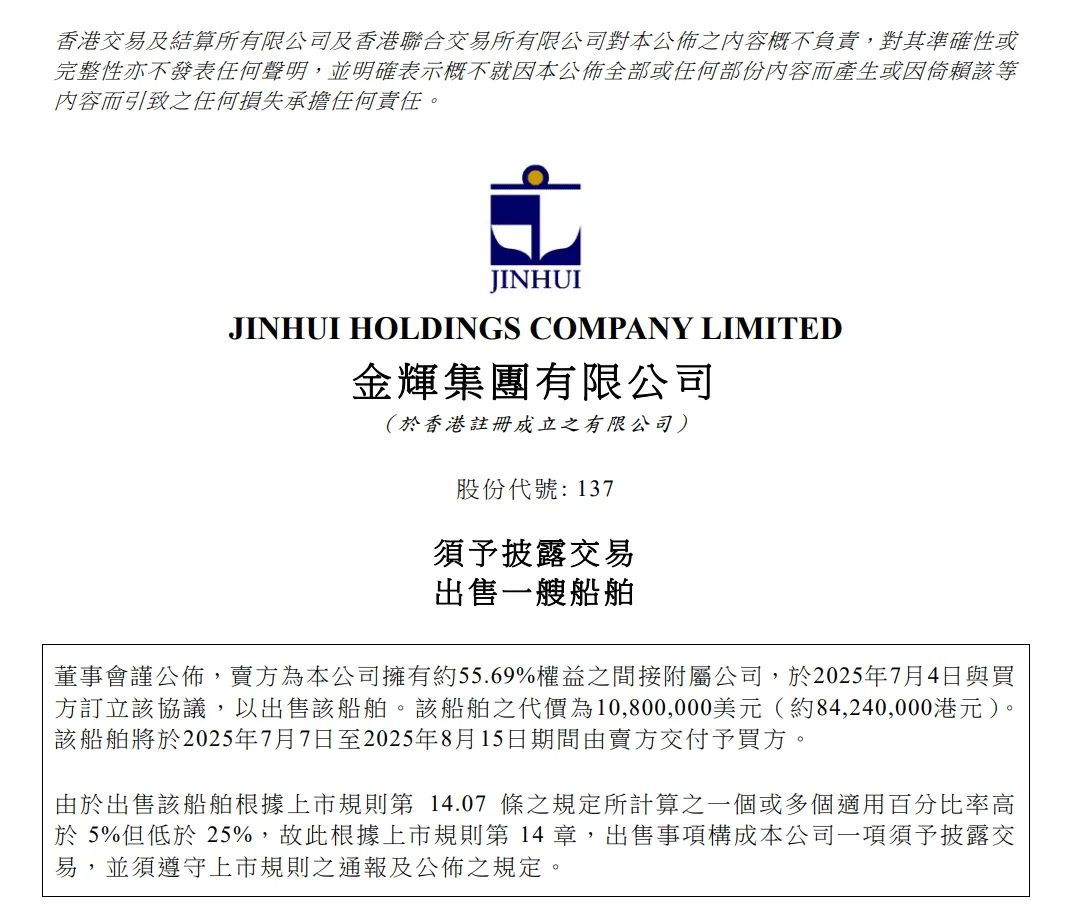 金辉航运表示,此次出售为公司重新调整船队组合,并在当前高风险及波动的市场环境中降低我们的运营风险提供了机会,同时公司可通过该出售事项提升营运资金状况,进一步巩固流动性及整体财务状况。