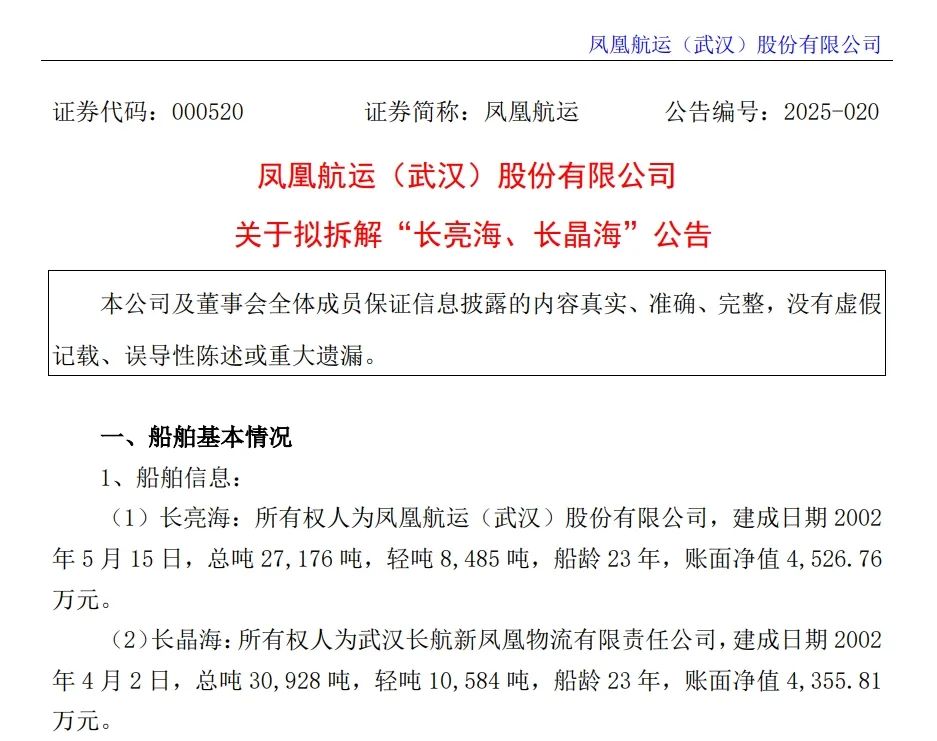 7月11日,凤凰航运(武汉)股份有限公司(证券代码:000520,证券简称:凤凰航运)发布公告,公司拟送拆两艘老旧散货船。