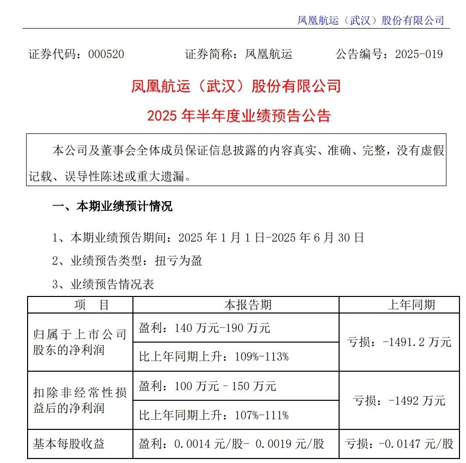 在同日《2025 年半年度业绩预告公告》公告中,凤凰航运预计今年上半年归属于上市公司股东的净利润为盈利140 万元-190 万元,而去年同期为亏损1491.2 万元;扣除非经常性损益后的净利润为100 万元–150 万元,而去年同期为亏损1492 万元。