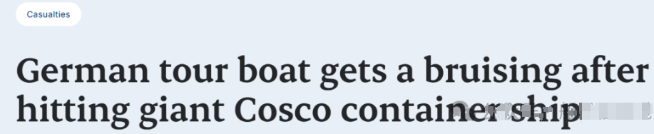 7月14日,一艘德国游船与中远海运旗下超大型集装箱船“Cosco Shipping Capricorn”(中远海运摩羯座)号在德国汉堡港托勒洛特集装箱码头相撞。