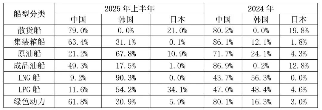 2024年和2025年上半年中韩日主要船型市场份额情况
