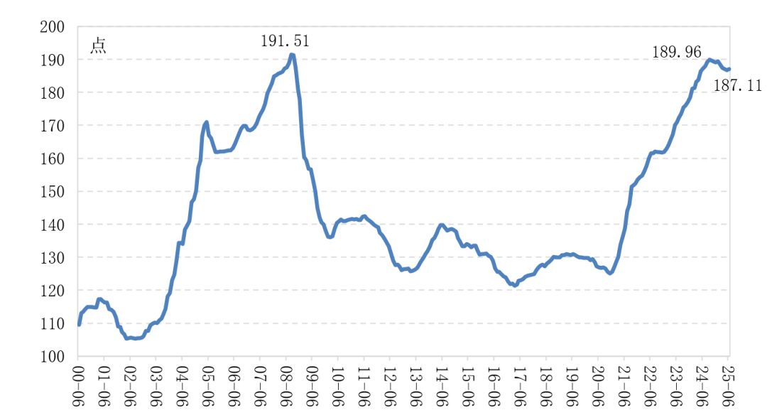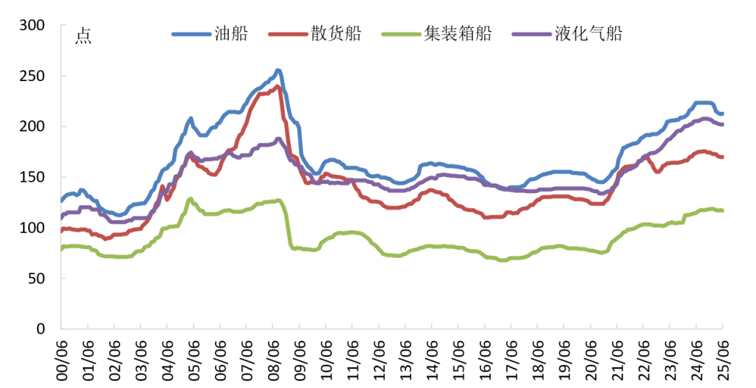 6月克拉克森新造船价格指数收于187.11点,较年初下滑1.2%,较本轮高点189.96下滑1.5%。分船型看,油船新船价格指数跌幅最大,6月收于212.37点,较年初下跌4.7%,同比下跌4.8%;散货船、液化气船6月分别收于169.72点、201.98点,较年初分别下跌2.0%、1.9%,同比分别下跌2.3%、1.4%;集装箱船仍同比上涨,6月收于117.04点,较年初下跌1.3%,但同比上涨2.3%。