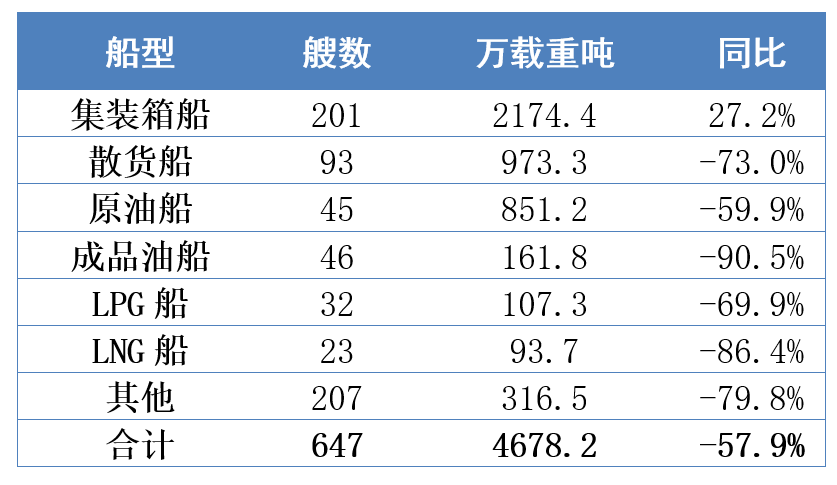 美国关税政策以及“301调查”限制措施,导致船东观望情绪加剧,全球新船订单明显萎缩。根据英国克拉克森研究公司数据统计,上半年,全球共成交新船订单647艘、4678.2万载重吨,以载重吨计同比下滑57.9%,订单规模为本轮造船周期以来(2021年以来)的同期最低成交水平。从主要船型看,液化天然气(LNG)运输船需求疲软尤为突出,上半年共成交93.7万载重吨,以载重吨计同比下滑86.4%;散货船、原油船、成品油船和液化石油气(LPG)船成交规模分别为973.3万、851.2万、161.8万、107.3万载重吨,均同比下跌60%及以上;集装箱船成为市场唯一亮点,共成交2174.4万载重吨,以载重吨计同比上涨27.2%,占同期全部订单的46.4%。
