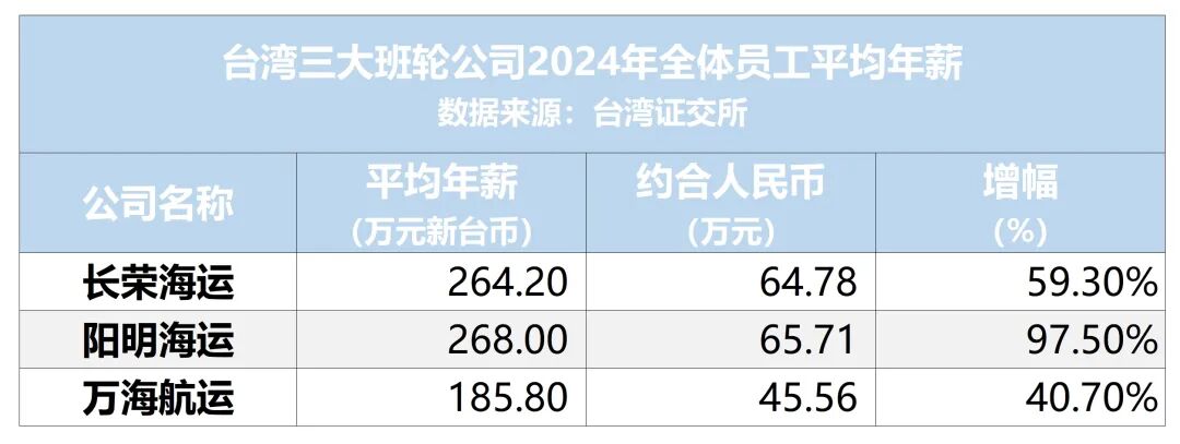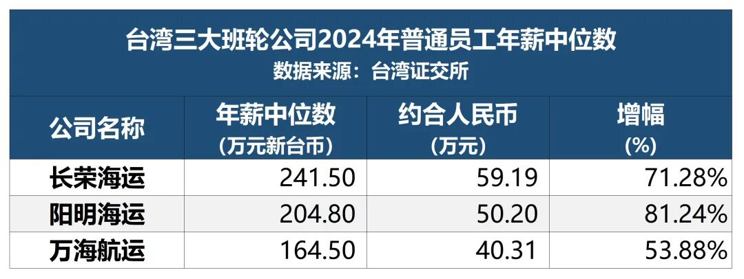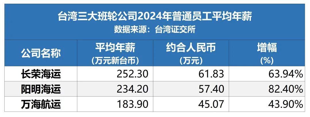 2024年,台湾三大班轮公司普通员工平均年薪为:长荣海运252.30万元新台币(约合61.83万元人民币),同比增长63.94%;阳明海运234.20万元新台币(约合57.40万元人民币),同比增长82.40%;万海航运183.90万元新台币(约合45.07万元人民币),同比增长43.90%。