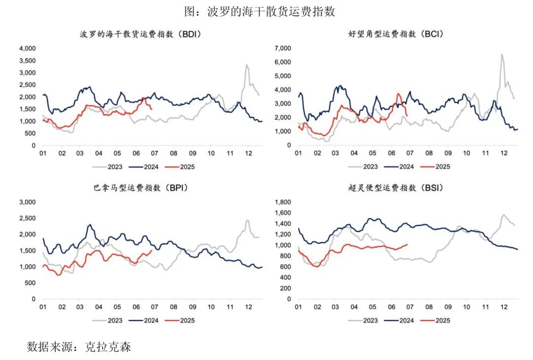 2025 年上半年,国际干散货航运市场整体表现较去年同期明显下滑,BDI、BCI、BPI、BSI 均值分别为 1,290、1,904、1,189、889点,同比分别下降 30%、33%、33%、30%,主要受终端需求偏弱、国内港口原材料库存高企等因素影响。第一季度,由于澳洲飓风影响贸易发运,BDI 在春节后的反弹节奏慢于往年;第二季度,受到关税政策不确定性影响,贸易商保持谨慎、市场活跃度下降,4-5 月 BDI 表现弱于过去两年,但随着海外矿山季末冲量,BDI 迎来趋势性回升,并曾一度超过 2024 年同期。