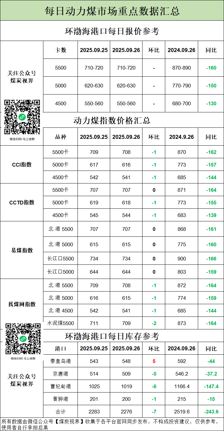 9月26日动力煤市场重点数据汇总