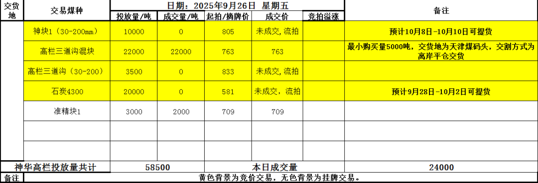 可可盖混煤9月26日竞拍结果:3.3万吨以433-434元/吨全部成交,加权平均单价为433.09元/吨,较上期457.24下降24.15元/吨。