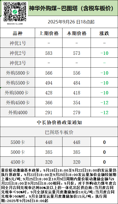 汇能城塔煤矿2025年9月26日下午16:00时执行: