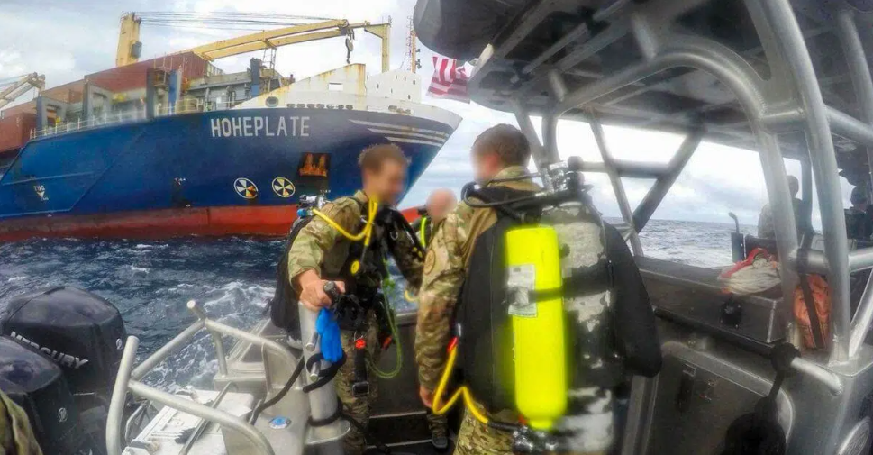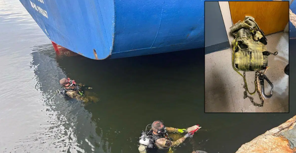 CBP官方社交媒体账号上分享的照片显示,潜水员在货轮船尾处拆除可卡因包裹。边境巡逻队称,这是潜水队首次执行此类行动。