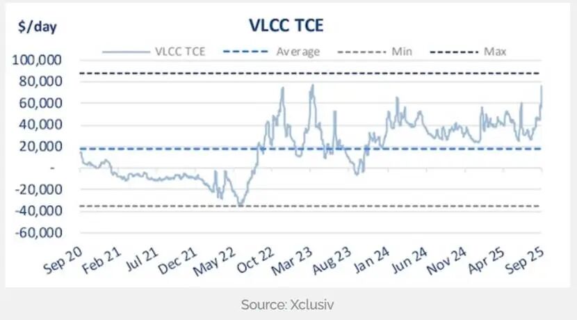 过去数周VLCC运输市场表现强劲。船舶经纪公司Xclusiv在其最新周报中指出,VLCC市场在9月迎来拐点。波罗的海基准指数从9月1日约45155美元/天,飙升至9月18日的87532美元/天,短短两个半交易周涨幅高达94%。9月10日后,涨势进一步加速,于11日突破70000美元/天关口,17日触及88,000美元/天,月均价格目前约为65300美元/天。其背景至关重要:直至8月底,年内高点仅略高于60500美元/天。因此,此番行情并非温和的价格重估,而是市场格局的根本性转变。