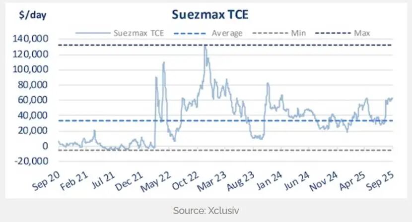 据Xclusiv分析,以当前87500美元/天的水平计算,已达到2025年迄今均值(约41500美元/天)的2.1倍,并为过去5年均值(约17400美元/天)的5倍。上一次触及高位是在2020年4月30日,当时正值浮式储油需求高峰,波罗的海指数报92500美元/天,并在当月下旬短暂冲至更高。即便2023年3月的反弹,也仅止步于77600美元/天。换言之,此次9月的突破是自疫情引发的储油潮以来最强劲的一次,亦是2025年VLCC首次在运力层面从中小型原油船手中重新夺回主导权。