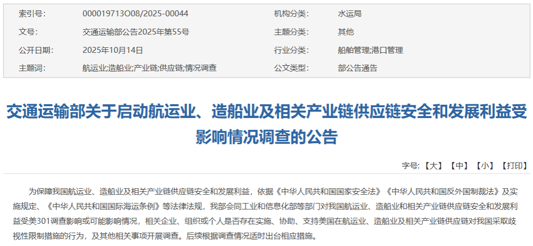 10月14日,交通运输部与商务部连续发布多项重磅公告,打出捍卫国家利益的“组合拳”。交通运输部印发《对美船舶收取船舶特别港务费实施办法》,并同步启动对我国航运、造船产业链受美301调查影响情况的调查;商务部依法决定将韩华海洋株式会社5家美国子公司列入反制清单。这一系列措施充分展现了中方坚决反制美国单边歧视行为、维护本国造船业及相关产业链供应链安全与发展利益的坚定立场。