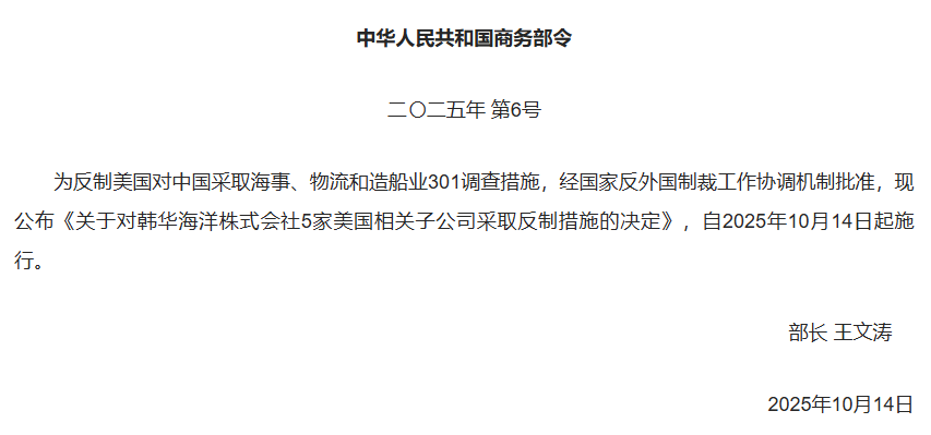同日,商务部发布公告,为反制美国对中国采取海事、物流和造船业301调查措施,经国家反外国制裁工作协调机制批准,现公布《关于对韩华海洋株式会社5家美国相关子公司采取反制措施的决定》,自2025年10月14日起施行。